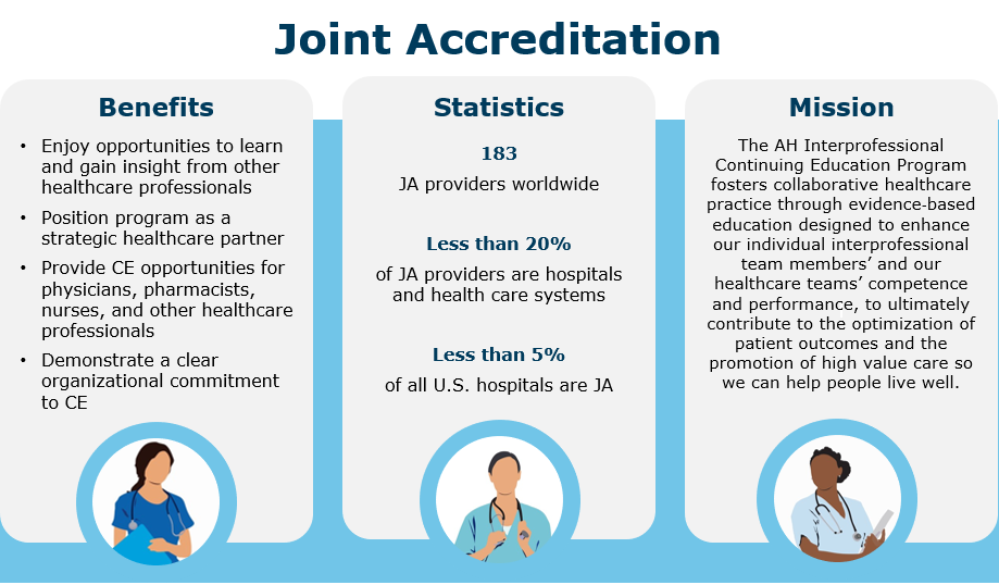 Joint Accreditation for Interprofessional Continuing EducationTM is the first and only innovation in the world offering multiple accreditations in one review process, Joint Accreditation promotes interprofessional continuing education (IPCE) activities specifically designed to improve interprofessional collaborative practice (IPCP) in health care delivery. A leading model for IPCP itself, Joint Accreditation establishes the standards for education providers to deliver continuing education planned by the healthcare team for the healthcare team.