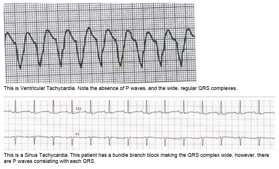 If the rate is tachycardic and not sinus, then the first question is whether the QRS complexes are narrow or wide. This can often be quite difficult to ascertain depending on the rate. “Classic” Ventricular Tachycardia (Vtach) has a sine-wave appearance, with wide complex, regular QRS complexes.