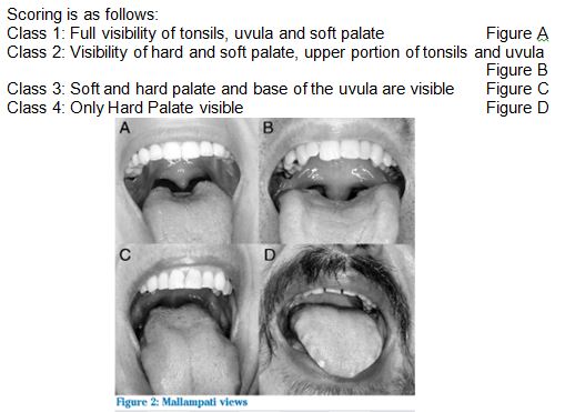** Physical examination of the airway may include the Mallampati classification. In anesthesiology, the Mallampati score, also Mallampati classification, is used to predict the ease of intubation. It is determined by looking at the anatomy of the oral cavity; specifically, it is based on the visibility of the base of uvula, faucial pillars (the arches in front of and behind the tonsils) and soft palate. Scoring may be done with or without phonation. Higher Mallampati Score (Class 4) is associated with more difficult intubation as well as a higher incidence of sleep apnea.